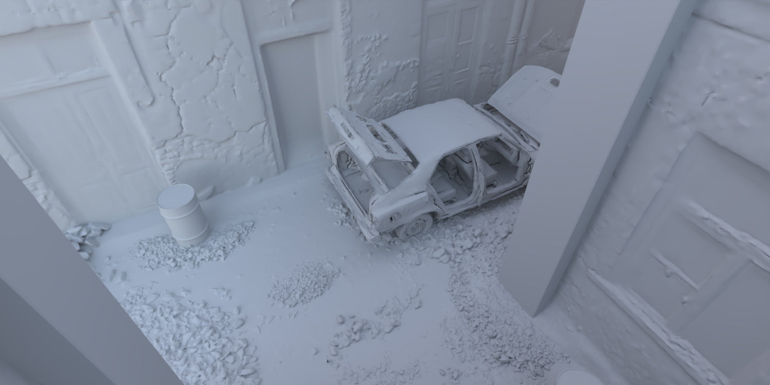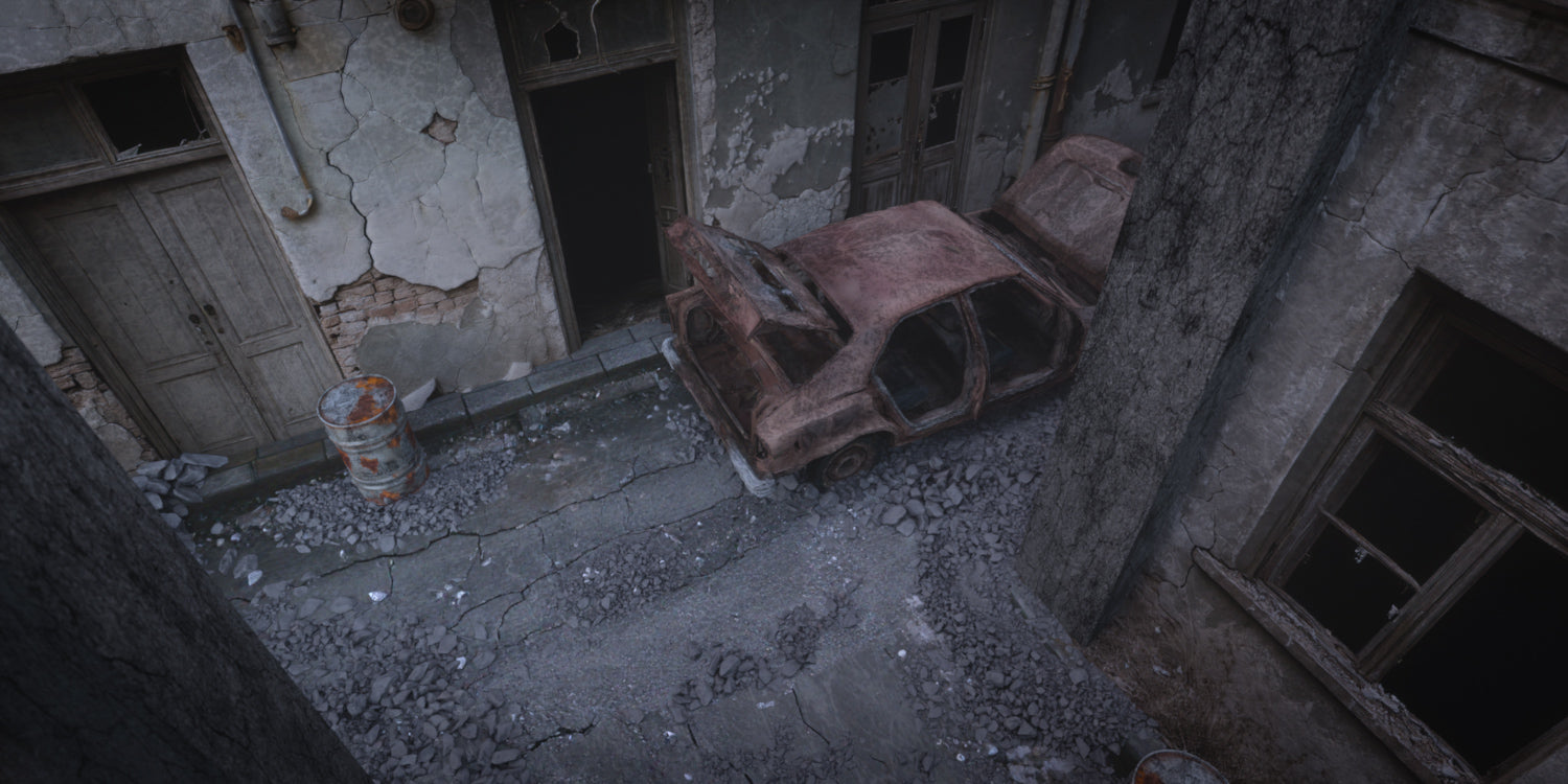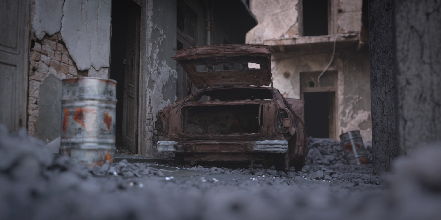 - Scene props include: building, ground, car, pebbles, barrel, corner and a black wall for covering light leaks