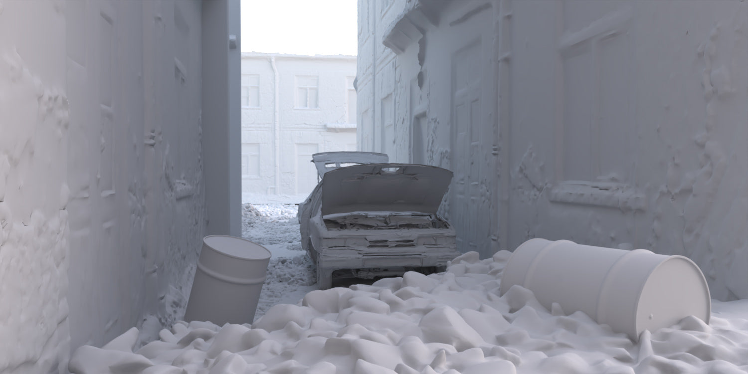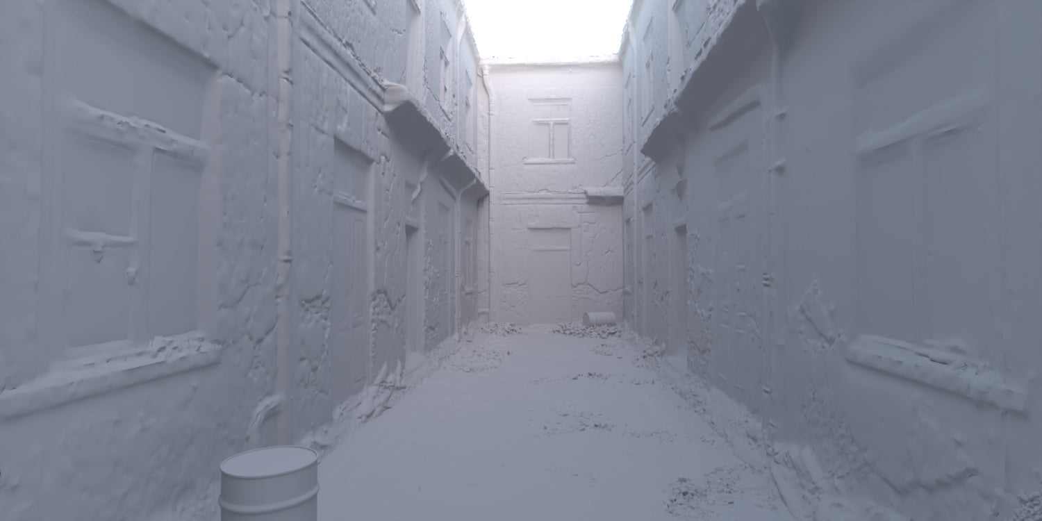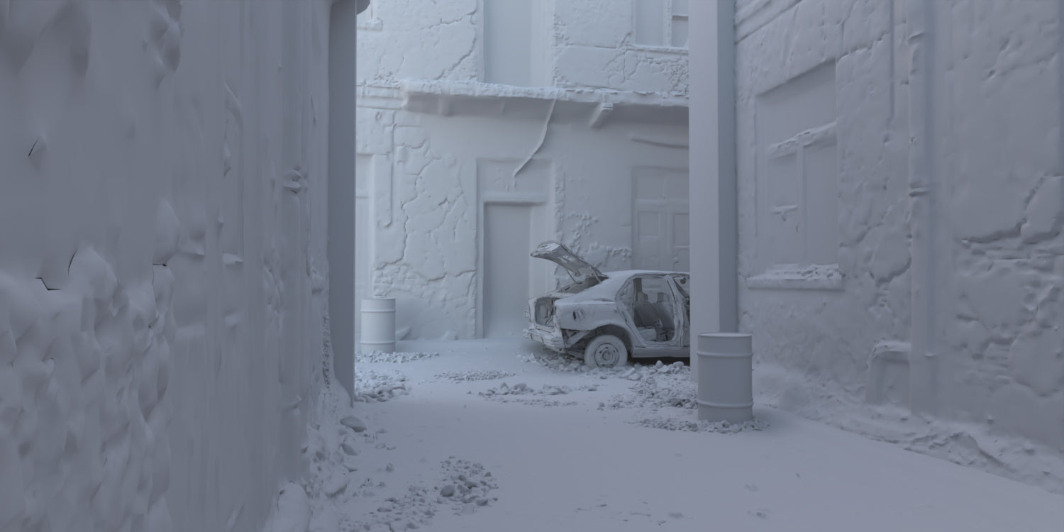 - Scene props include: building, ground, car, pebbles, barrel, corner and a black wall for covering light leaks